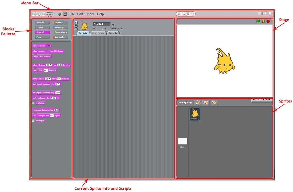 The most fundamental item in BYOB is a “sprite.” A sprite is an object that can be programmed as far as how it looks (called the sprite’s “costume”), sounds it can make, and actions (or “scripts”) that control its behavior. The middle and largest area of the BYOB window shows information on the currently-selected sprite, so it’s called the “sprite info pane”notice the three tabs in the sprite info pane identifying these three components of the current sprite. Try clicking on each one to see what it displays. This sprite comes up by default when BYOB is started, and the “costume” -the appearance -is the BYOB mascot, named “Alonzo.” To start with, this sprite has no scripts defined, and no sounds, and only one costume.