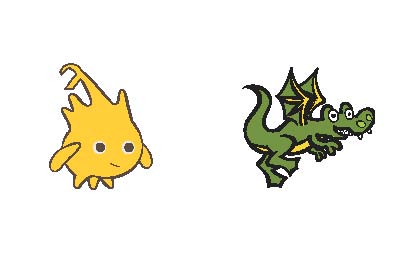 To Do: Create a second sprite in the basic setup. There are three ways to do this, using the three buttons at the top of the sprites pane -the first button (the star with the paintbrush) allows you to draw whatever picture you want; the second button (the star with the folder) allows you to load a sprite picture from a file; the third button (the star with the question mark) gives you a random picture. If you forget what these do, you can “hover” the mouse pointer over any button and it will give you a description of what the button does. For our first experiment, let’s load a sprite from a file, so click on the star with the folder. Are you curious about what’s in all of those folders? Click on any of the folders and look through the sprites that are available -if you enter a folder and want to return to where you were before, you can click the up arrow. After you click around a bit to get familiar with what’s there, pick one particular sprite that you like -for example, let’s pick “dragon1-a” under “Fantasy.” If you do this, it will create a new sprite in the sprites pane, and it will draw it on the stage -centered, so it’s right on top of Alonzo! You can use the mouse to move these around on the stage, so move them so that the dragon is to the right of Alonzo. Your stage should now look like this: