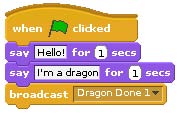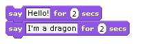 Now click the “say Hello! for 2 secs” button to see how to make the dragon say something. After 2 seconds (do you see why?) the speech bubble will disappear.