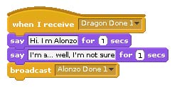 Now that the dragon can broadcast a message, there needs to be some way to receive that message and make it trigger an action. For this, use the “when I receive...” block -switch over to Alonzo, separate the actions from the “when green flag clicked” block (if you put that block in), and start Alonzo’s dialog with the “when I receive...” block -you should select the “Dragon Done 1” message for this block’s parameter. Next, put another broadcast block at the end of Alonzo’s dialog, named something like “Alonzo Done 1” -now Alonzo’s script should look like this: