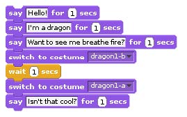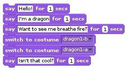 Now you have two different costumes for the dragon, and we’ll have the regular dragon switch to the fire breathing dragon after the third speech bubble. To do this, switch back to the dragon’s “Scripts” tab, and drag the “switch to costume...” block out and put it under the speaking blocks. Make sure the costume name to switch to says “dragon1-b”, and now run the 4-block component by clicking on a purple part. Cool!