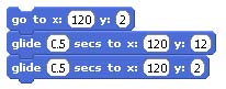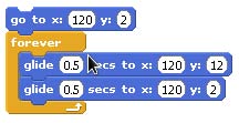 Next we want to move the dragon up and down, as if it is hovering. To do this, drag the “glide” block out and click it below the “go to” block. The first number controls the speed (the time, in seconds, of the glide), and the last numbers give the final location of the end of the glide path. We want the dragon to go up a little, so set the (x,y) coordinates at the end of the glide path to the same x value as the beginning position, and the y coordinate to be 10 greater -for example, if the starting position is (120,2), then you should glide to (120,12). Finally, put another glide block below this one to glide back to the original position, and experiment with time values to get a something that looks right to you. For example, your final movement block might look like this: