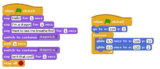 Now click the green flag above the stage, and both sequences will be run. The dragon will fly up and down while it is talking and breathing fire!