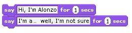 Tip: If you need to change several parameters, click on the first one -in this example, it is to change the first text to “Hi, I’m Alonzo.” After you type the text, you don’t need to take your hands off the keyboard to select the next parameter with the mouse -just hit the “Tab” key and it will switch over to the next parameter, which you can type in. It’s often faster to drag a bunch of blocks that you need out, snap them together without worrying about the arguments, and then change all the parameters at once by tabbing between them.